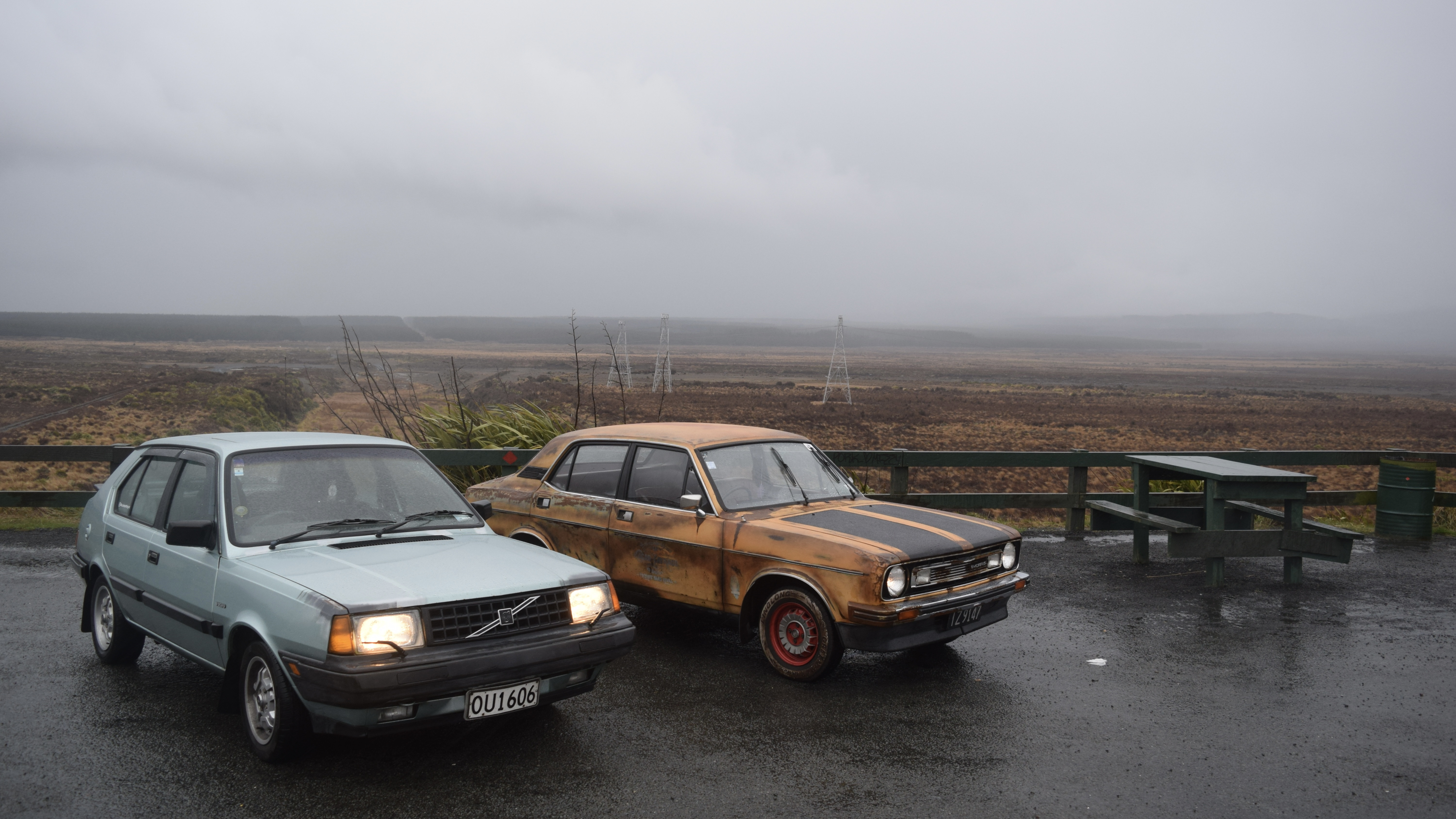 Samuel Graham’s Volvo 360 and a friend’s Morris Marina at the Central Plateau near Mt Ruapehu.